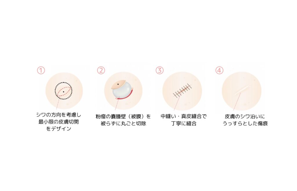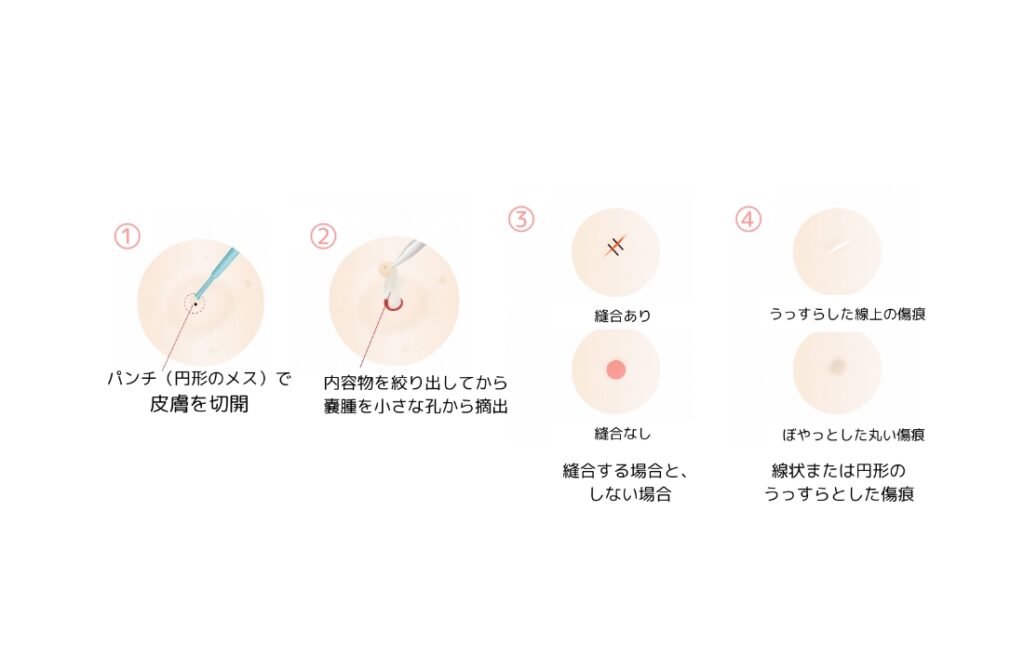炎症がない場合には皮膚の自然なラインに沿った切開やくりぬき法で傷跡を最小限に