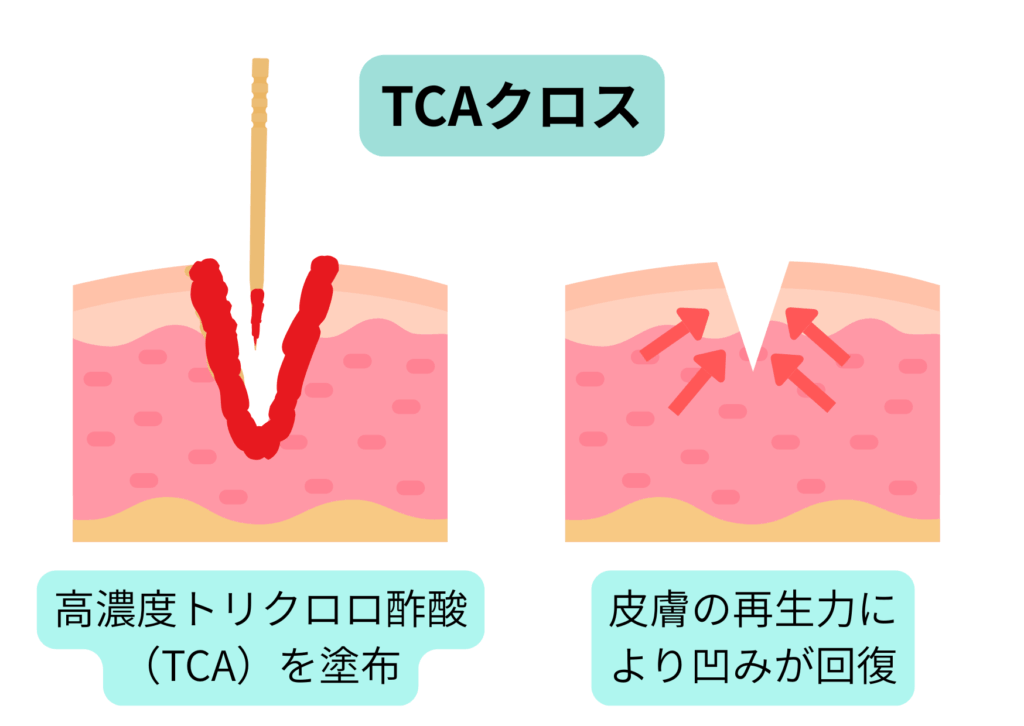 クレーターのように大きく開いた毛穴や深いニキビ跡を改善する治療です。高濃度トリクロロ酢酸(TCA)をくぼみにピンポイントで塗布し、酸の力で皮膚の一部を溶かして再生を促します。 再生の過程でコラーゲンが新しく作られ、凹みがふっくらと持ち上がり、肌表面がなめらかになります。繰り返すことでより自然で均一な肌質へ導きます。